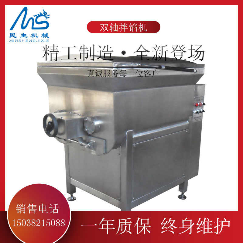 雙軸雙速真空拌餡機(jī)主要作用是在肉制品加工工藝中,不可缺少的混合料設(shè)備,不論是香腸類產(chǎn)品加工的工藝、肉丸加工工藝,就是生產(chǎn)水餃、混沌類面食產(chǎn)品的可選設(shè)備。