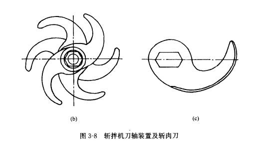 斬拌機有6把凸刃口刀在軸線方向相互錯開,螺旋狀安裝在刀軸端部。由于刀軸軸線只能與環(huán)形斬肉盤的某一徑向平面垂直.故每一個刀片上的回轉(zhuǎn)半徑的點與斬肉盤內(nèi)壁的間隙各不相同.為防止刀片與斬肉盤內(nèi)壁發(fā)生千擾,在刀軸上裝有若干調(diào)整墊片3.