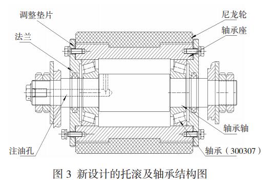 工作中,外圈旋轉(zhuǎn),內(nèi)圈安裝在軸承軸上且軸固定在支架上不動(dòng)。原滾揉機(jī)托滾及其軸承安裝結(jié)構(gòu)見(jiàn)圖 2。新設(shè)計(jì)的滾揉機(jī)托滾及其軸承結(jié)構(gòu)見(jiàn)圖 3。