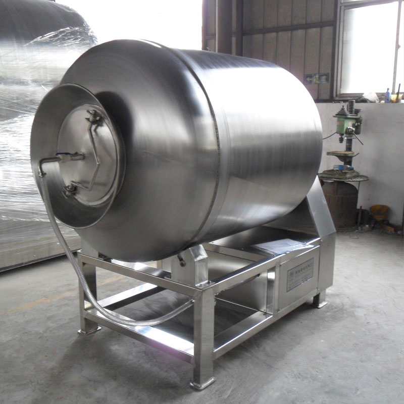 1、滾筒:多是選用不銹鋼材料做成的直徑為900~1500mm的滾筒,內(nèi)不部有螺旋式槳葉,在滾揉時能把肉料刮起,同時由于槳葉的傾斜,使肉料向低端滑下,起到對肉料的擠壓、摔打作用。在可移動式滾揉筒中,罐體底部裝有四個 腳輪,以利于移動罐體。但固定式的沒有腳輪。