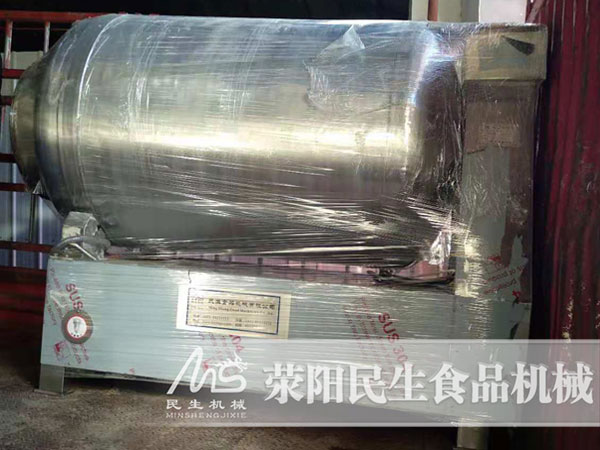 江蘇客戶是正在生產(chǎn)中的企業(yè),是因?yàn)楫a(chǎn)量加大需要增加設(shè)備??蛻粲嗁?gòu)的真空滾揉機(jī)是要在冷庫(kù)內(nèi)使用,冷庫(kù)門只有1.1米,但是客戶又要求產(chǎn)量,所以我們?yōu)榭蛻舳ㄖ屏艘豢罴娱L(zhǎng)型的真空滾揉機(jī)。另外,客戶加工的是雞肉,滾筒槳葉我們?yōu)榭蛻粼O(shè)計(jì)的是V字型的。V型槳葉多用于比較小的肉塊,以及雞鴨魚(yú)等產(chǎn)品。真空滾揉機(jī)可以用來(lái)腌制各種肉食品、咸菜和休閑類食品,在這些食品中加入滾揉處理,可以縮短腌制時(shí)間、上色均勻、增加鮮嫩度、提高出品率,從而被越來(lái)越多的食品加工企業(yè)所應(yīng)用。比如我們經(jīng)常吃的鹵牛肉、五香驢肉、臘羊肉、無(wú)骨雞柳、雞排、鴨脖等肉食品和酸菜、蘿卜干、榨菜等咸菜類食品以及豆干、魔芋豆腐等休閑類食品均可使用真空滾揉機(jī)進(jìn)行腌制。